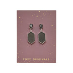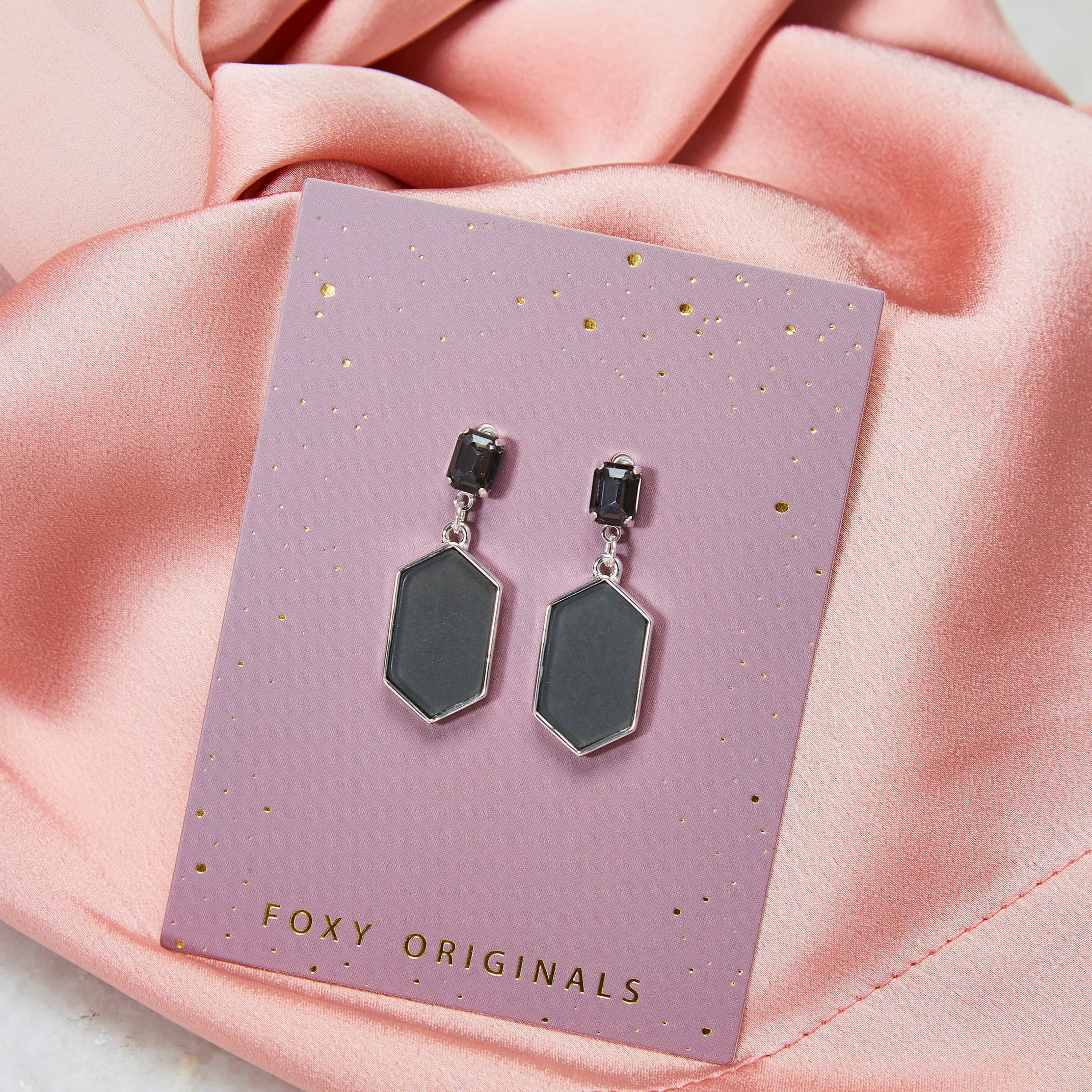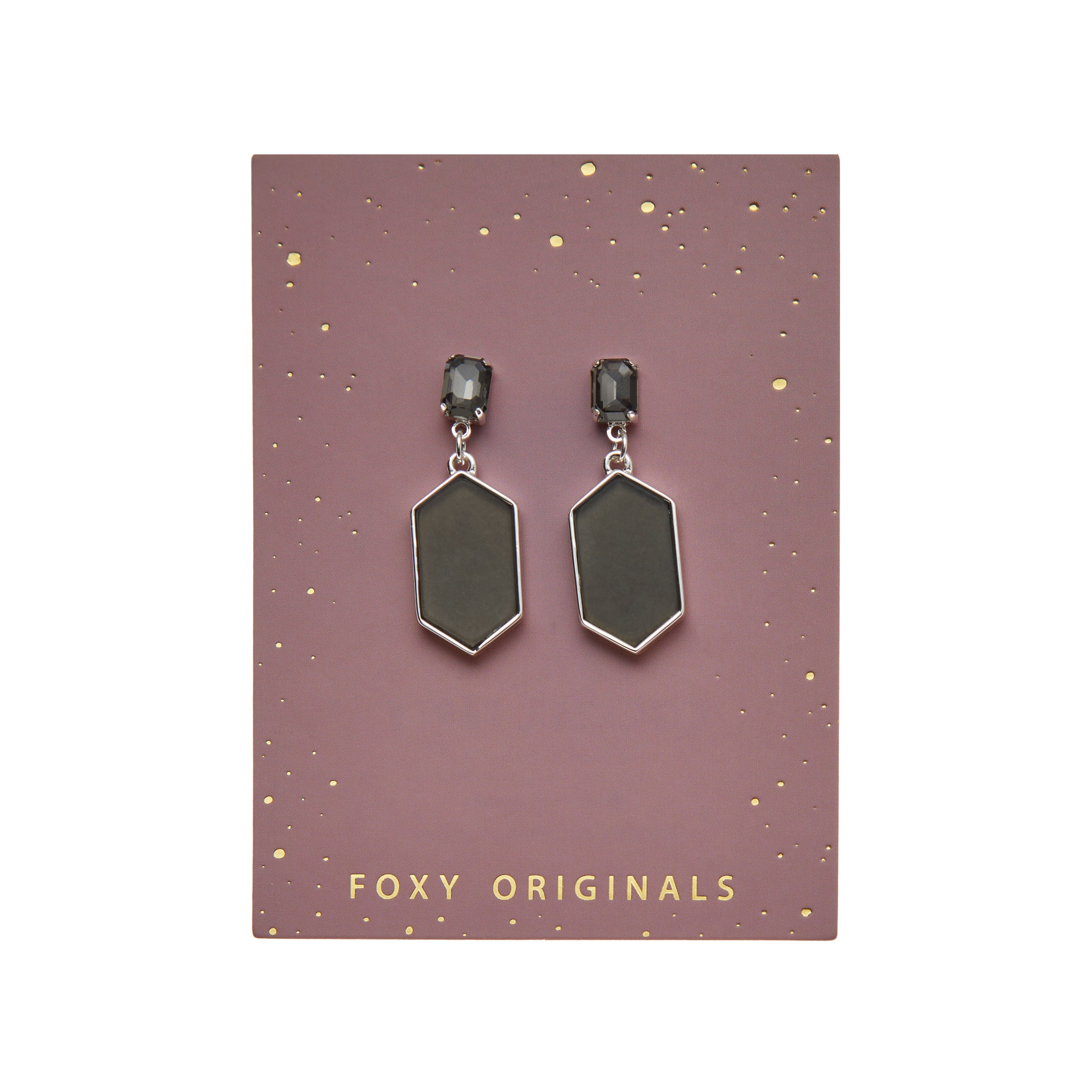Whether it’s a holiday party or fancy dinner date, make sure these earrings are your plus one.  Diamond shaped resin pendants hang from shimmering faceted stones.  Available in Gold/Grey and Silver/Grey.